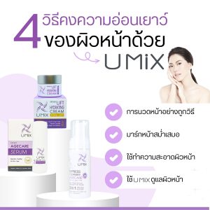 หยดยูมิกซ์เอจแคร์เอสเซนต์ ลงบนฝ่ามือปริมาณเล็กน้อย ทาลงบนผิวหน้าที่ชื้นหลังการล้างหน้าตบเบาๆ ให้เอสเซ้นซ์ซึมซาบลงสู่ผิว แนะนำให้ใช้สองเวลาเช้า และก่อนนอนจะให้ผลดีสุดในช่วงเวลากลางคืน