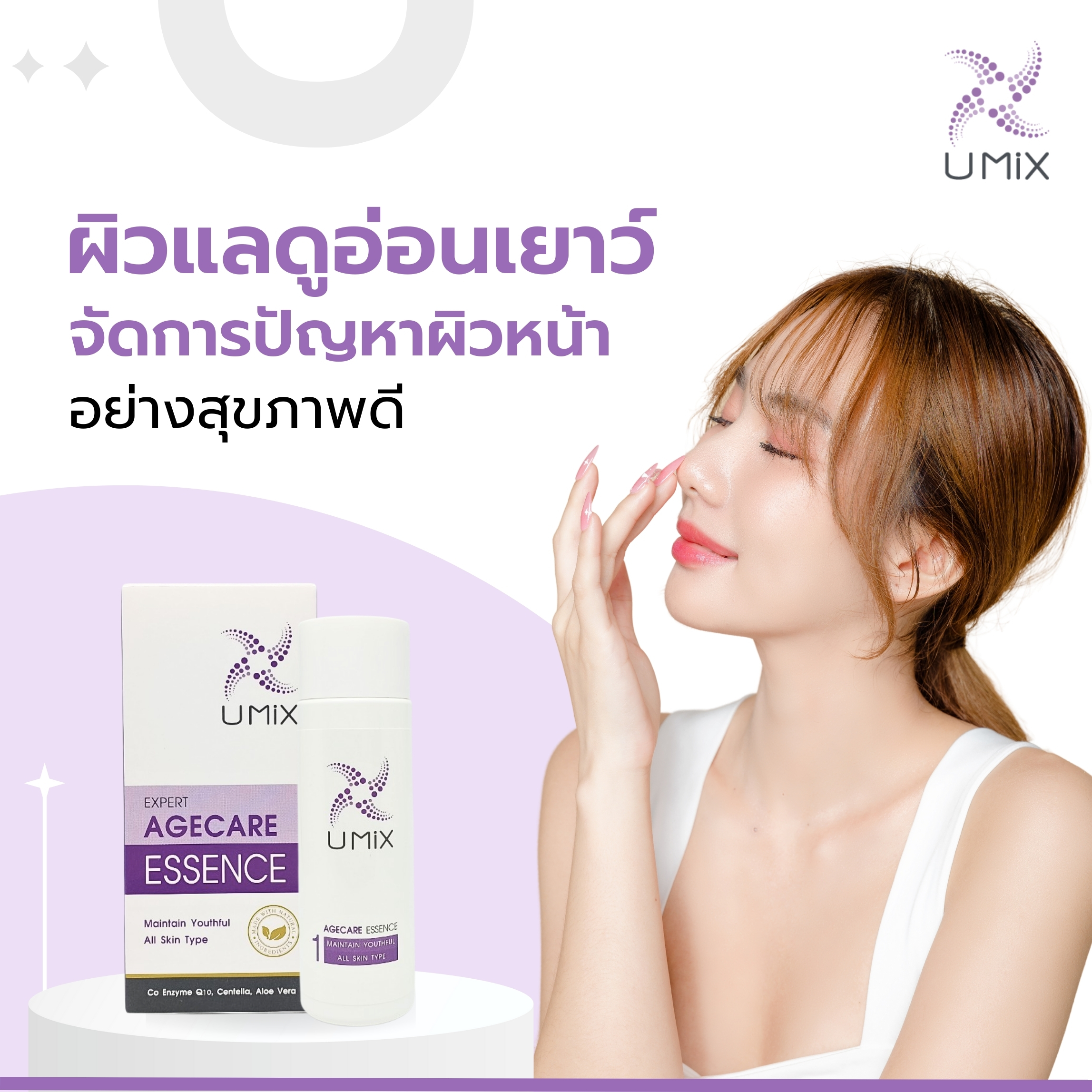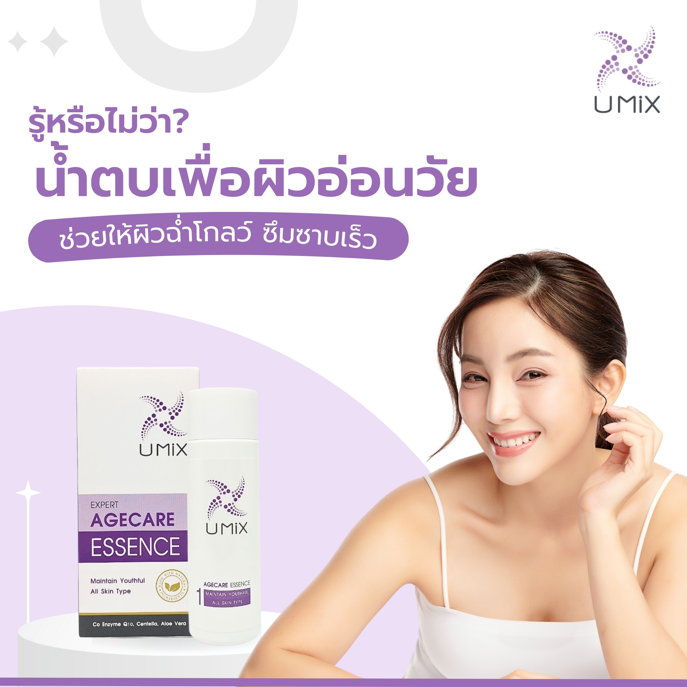 ยูมิกซ์ เอจแคร์ เอสเซนต์ การบำรุงระดับที่ลึกกว่า ดูแลให้ผิวอ่อนเยาว์ Essence ซึมซาบลึกสู่ผิว ปลุกผิวให้พร้อมรับสารบำรุงเข้มข้น Serum สารบำรุงเข้มข้น แก้ปัญหาที่ต้นเหตุอย่างรวดเร็ว เพื่อทุกสภาพผิว เอสเซนต์ บำรุงผิวหน้าเนื้อบางเบาซึมซาบเข้าบำรุงผิว ด้วยแร่ธาตุซิลิเซี่ยมสารสกัดจากว่านหางจระเข้ และใบบัวบกช่วยปลอบประโลมผิวทำให้ผิวเนียนนุ่มกระชับชุ่มชื้น แลดูอ่อนเยาว์