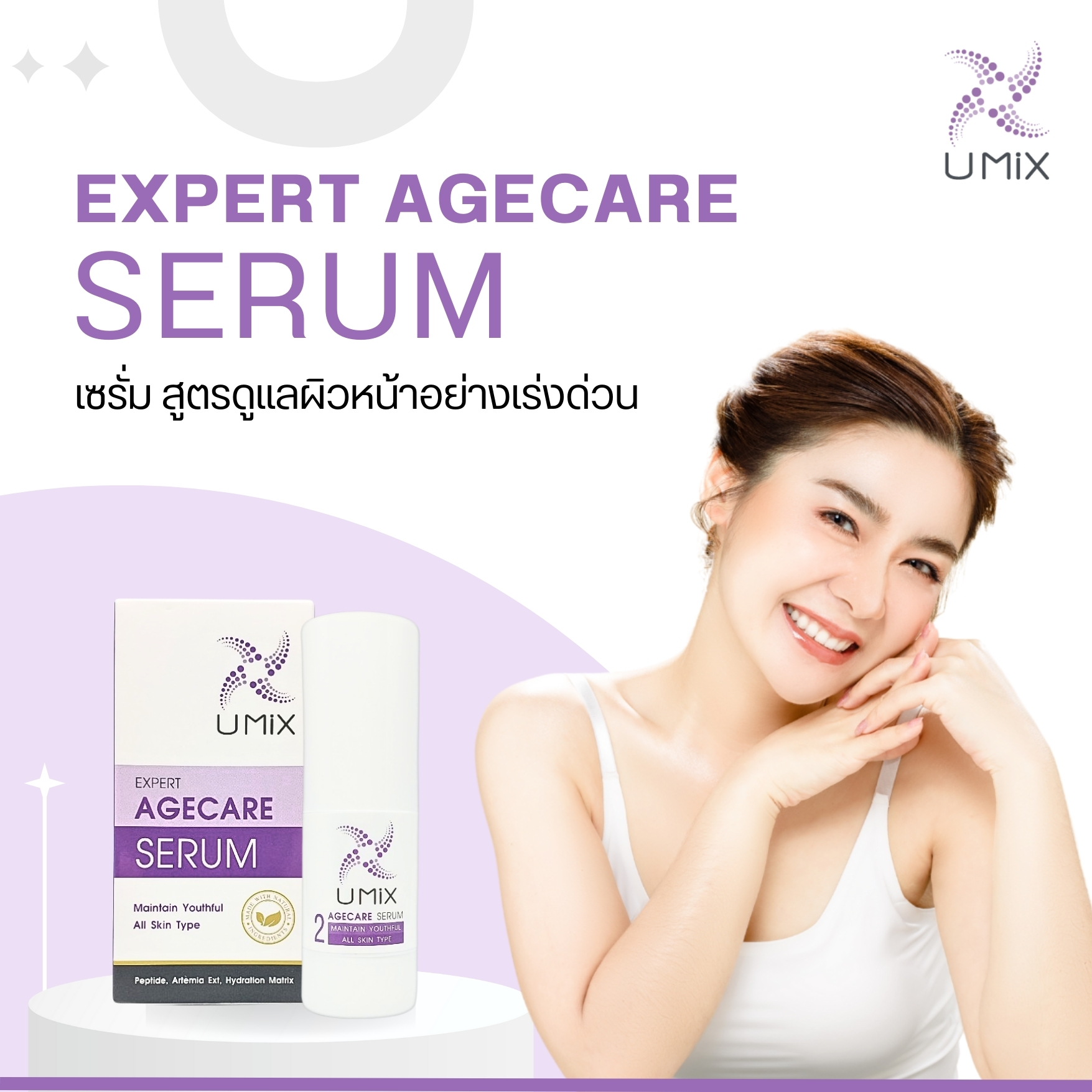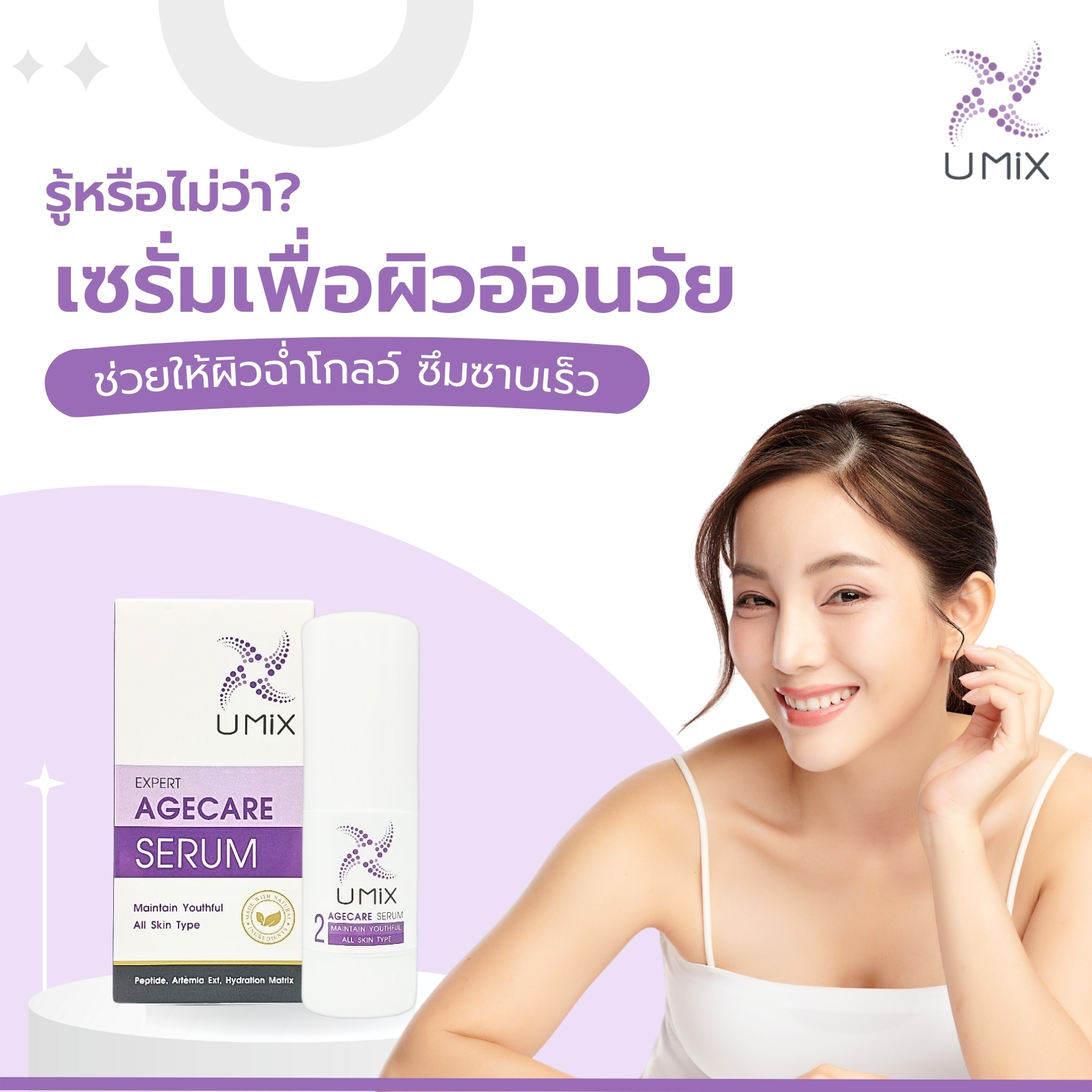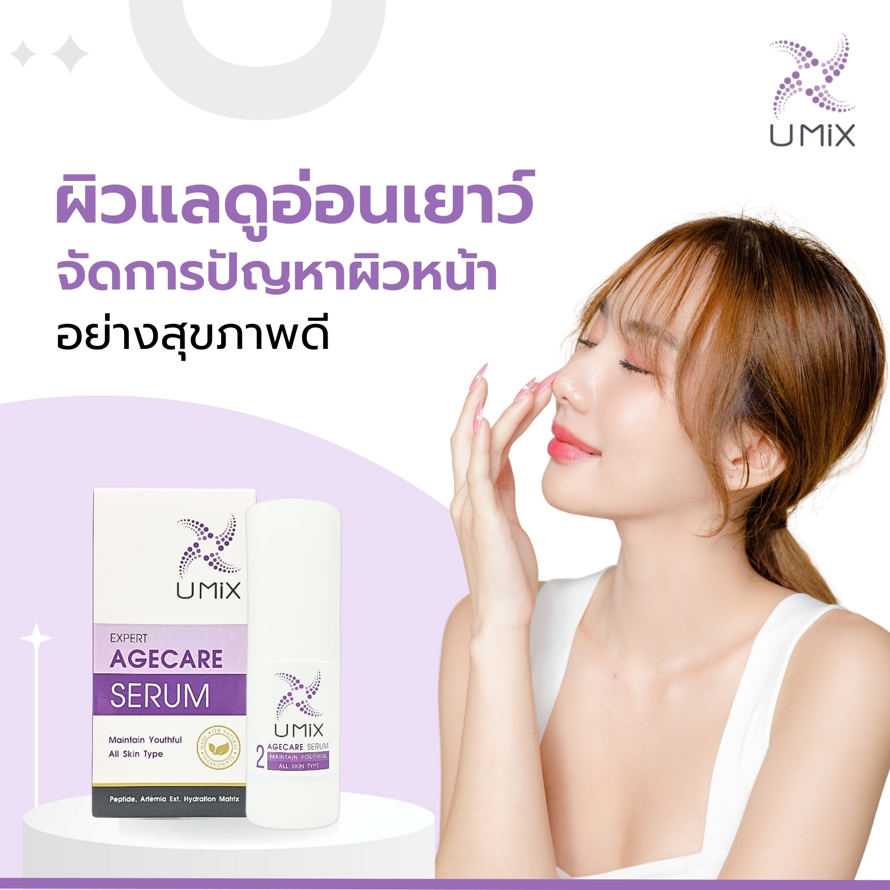 ยูมิกซ์ เอจแคร์ เซรั่ม เพื่อจุดเริ่มต้นของผิวอ่อนเยาว์ สุขภาพดี เอจแคร์เซรั่ม มีส่วนผสมของเปปไทด์ สารสกัดจากแพลงตอน แร่ธาตุ และสารสกัดธรรมชาติ พร้อมกับมอบความชุ่มชื้นด้วยยูมิกซ์ ไฮเดรชั่น แมทริกซ์ ได้แก่ เซราไมด์ 3 ไฮยาลูรอน มิลด์ไลปิด สารให้ความชุ่มชื้นชั้นสูงที่ซึมเข้าสู่ผิว และทำให้ผิวแลดูอ่อนเยาว์ อย่างที่ต้องการ