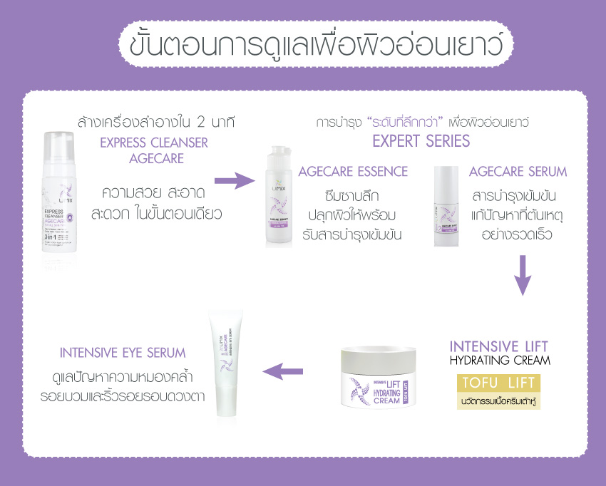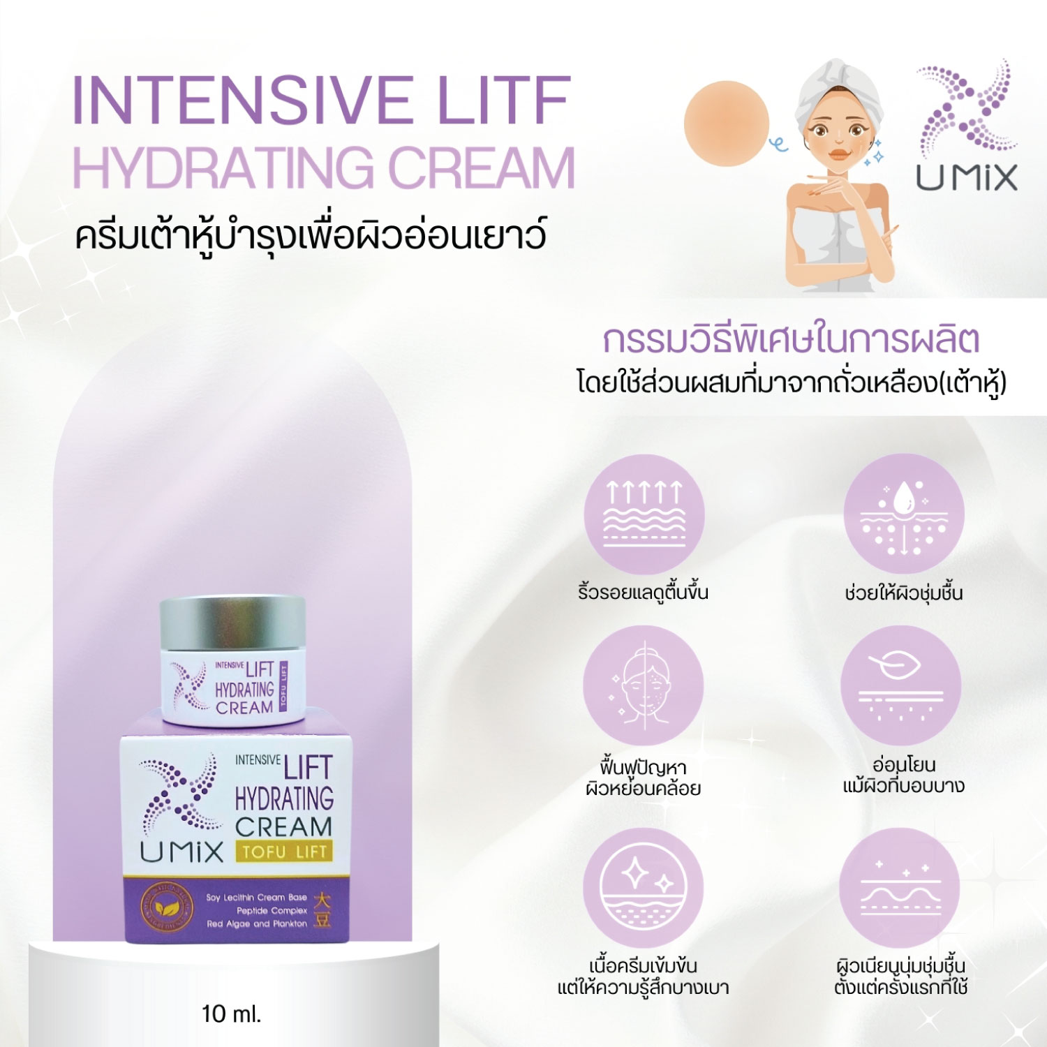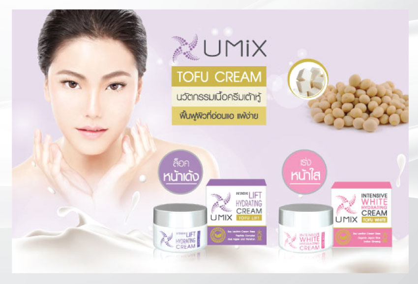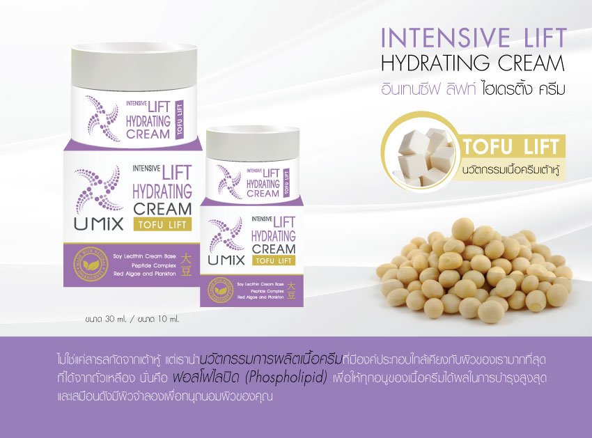 ครีมบำรุงเพื่อผิวยกกระชับสูตรเฉพาะของยูมิกซ์ ที่มีกรรมวิธีพิเศษในการผลิตโดยใช้ส่วนผสมที่มาจากถั่วเหลือง(เต้าหู้) ซึ่งเป็นสารกลุ่มเดียวกันกับองค์ประกอบหลักของผิวเนื้อครีมเข้มข้นแต่ให้ความรู้สึกบางเบา ซึมซาบเข้าสู่ผิวได้ดีและอ่อนโยนกว่าครีมทั่วไปให้คุณสัมผัสได้ถึงความเนียนนุ่มชุ่มชื้นตั้งแต่ครั้งแรกที่ใช้ พร้อมด้วยนวัตกรรมเปปไทด์โมเลกุล รวมถึงคุณค่าบำรุงจากสารสกัดสาหร่ายสีแดงและแพลงตอน ช่วยให้ผิวเนียนกระชับ ริ้วรอยแลดูตื้นขึ้น ฟื้นฟูปัญหาผิวหย่อนคล้อยและแห้งกร้านให้กลับมาดูชุ่มชื้นและอ่อนเยาว์